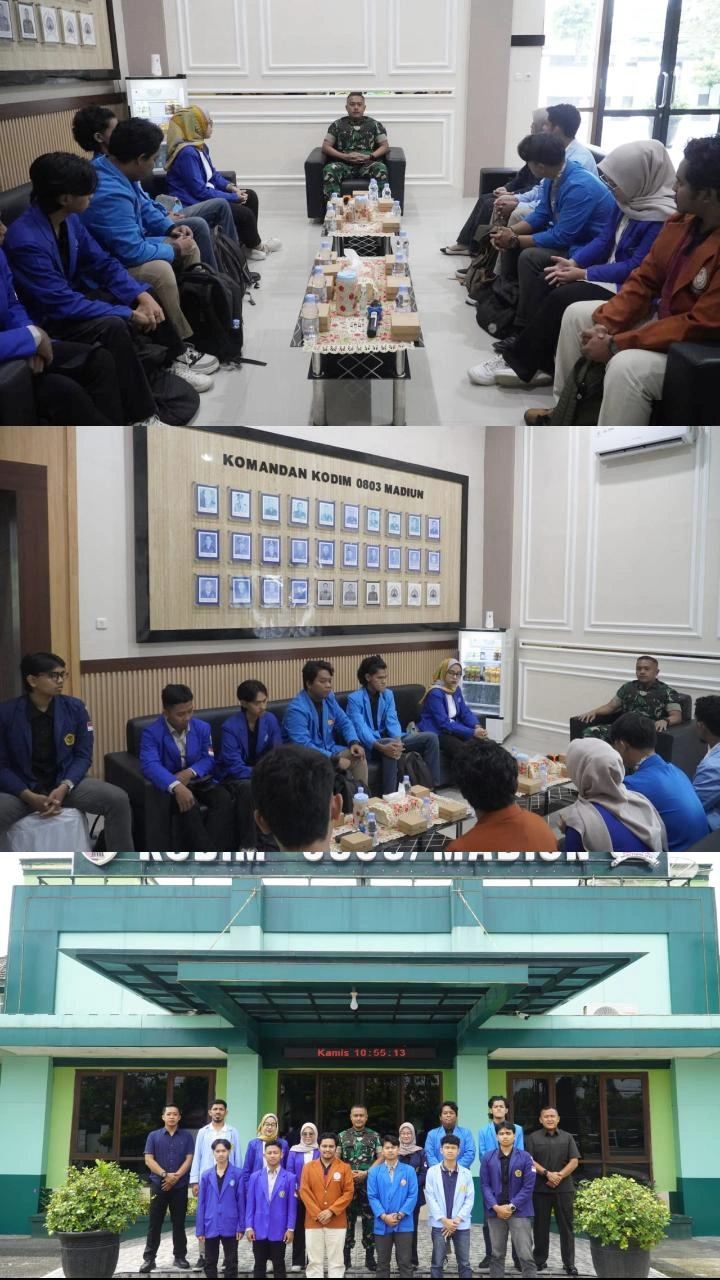 INDOBANGKIT.COM Madiun, – Dandim 0803/Madiun, Letkol Kav Widhi Bayu Sudibyo menggelar pertemuan dengan BEM (Badan Eksekutif Mahasiswa) Se-Kota dan Kabupaten Madiun, bertempat di Makodim 0803/Madiun, Jl. Pahlawan No. 50 Kota Madiun, Kamis (10/4/2025).