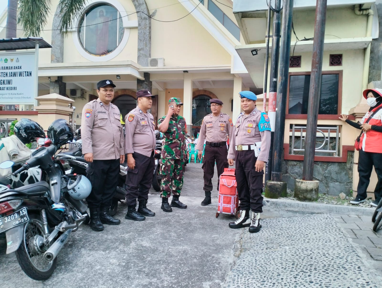 Ada puluhan personel Polres Kediri Kota berjaga sebelum ibadah di mulai personel tersebut terlebih dahulu melakukan sterilisasi,di sekitar Goa guna memastikan barang barang yang dapat membahayakan jemaat.