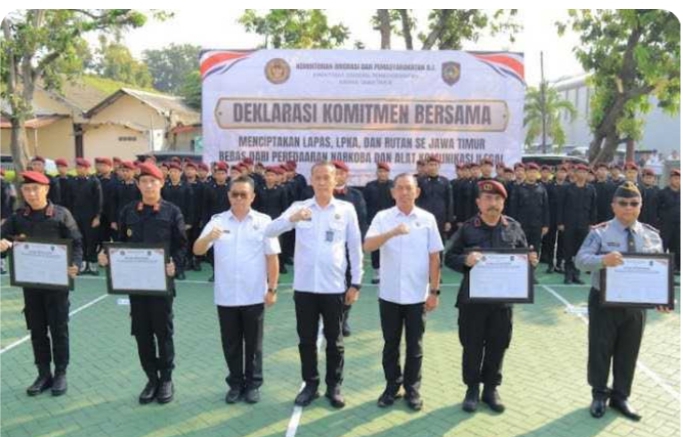 Indobangkit.com SIDOARJO — Kantor Wilayah Direktorat Jenderal Pemasyarakatan (Ditjen PAS) Jawa Timur menyatakan komitmen penuh untuk menciptakan Lapas dan Rutan yang bersih dari peredaran narkoba dan penggunaan telepon genggam ilegal. Komitmen tersebut dituangkan dalam kegiatan Deklarasi Komitmen Bersama, yang digelar Rabu (21/5) di Markas Kanwil Ditjenpas Jawa Timur.