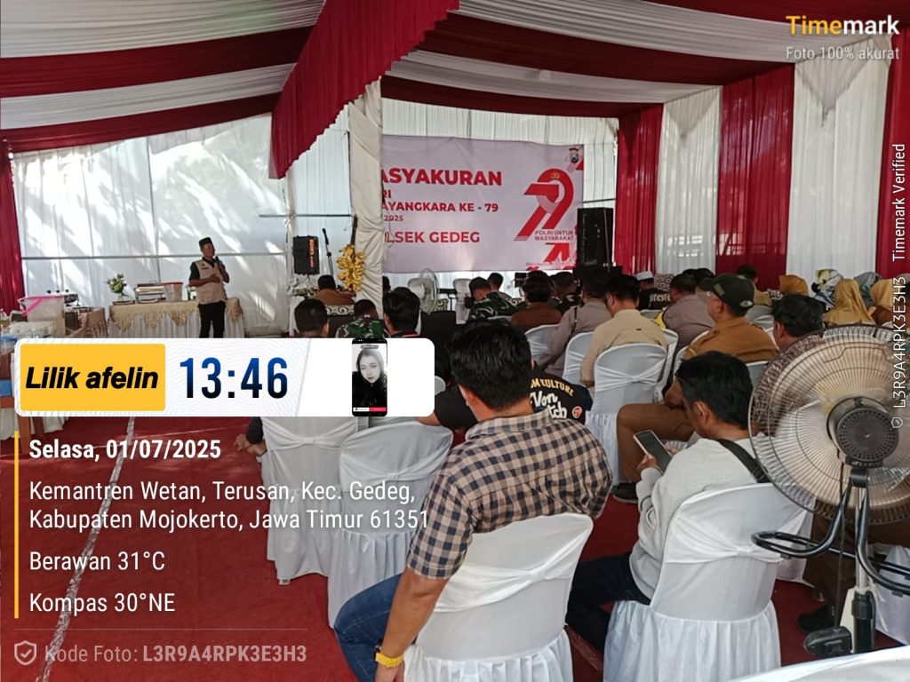 Indobangkit.com Gedeg, Mojokerto –1/7/2025.Dalam rangka memperingati Hari Bhayangkara ke-79 yang jatuh pada 1 Juli 2025, Kepolisian Sektor (Polsek) Gedeg yang dipimpin langsung oleh Kapolsek Gedeg, AKP Sukaren, S.H., menggelar acara tasyakuran yang berlangsung khidmat dan penuh rasa syukur.