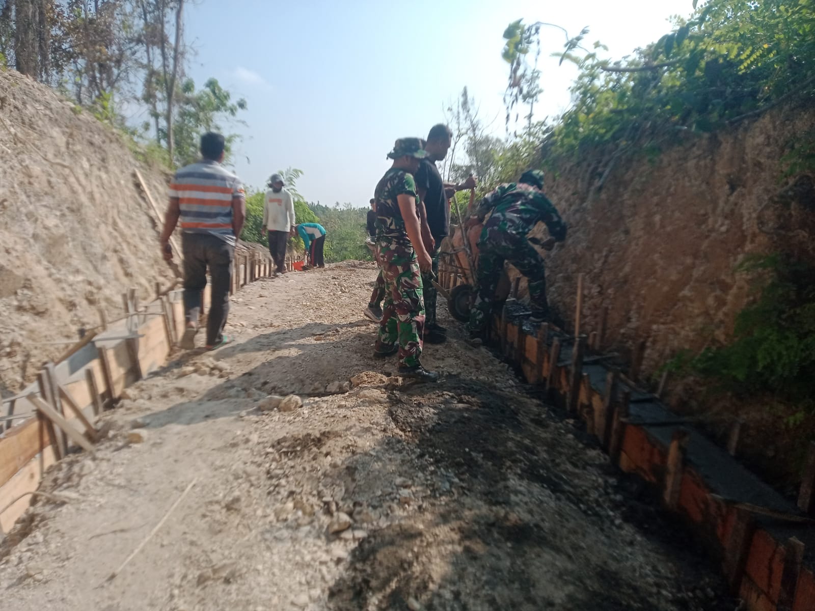Indobangkit.com Jombang – Program TNI Manunggal Membangun Desa (TMMD) ke 125 yang dilaksanakan oleh Kodim 0814/Jombang kembali menunjukkan komitmennya dalam membantu masyarakat,personil Koramil 0814/11 Sumobito tanpa mengenal lelah mereka bersama masyarakat setempat bergotong royong,salah satunya membangun jalan guna untuk memperlancar aktifitas masyarakat khususnya di Desa Kromong Kecamatan Ngusikan Kabupaten Jombang.