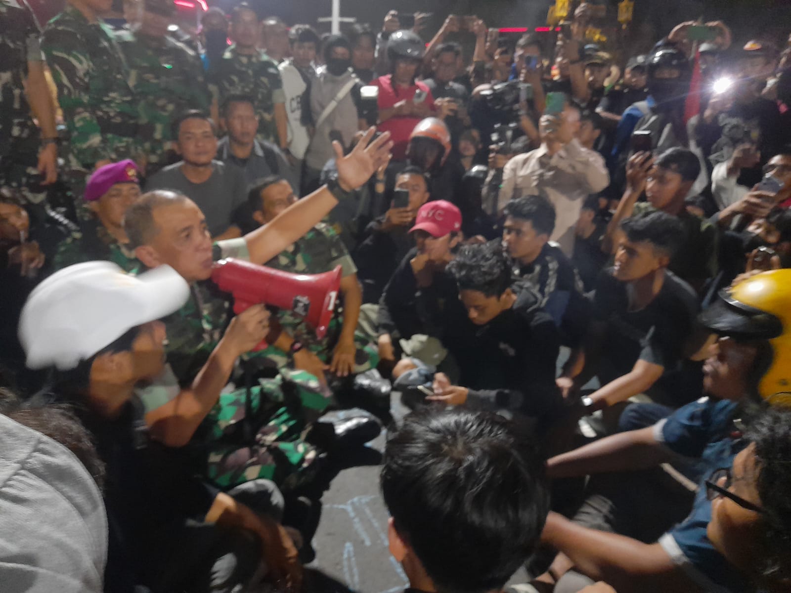 Dialog pun bergulir. Satu per satu perwakilan massa menyampaikan unek-unek dan aspirasinya. Situasi yang awalnya penuh kewaspadaan, berubah cair ketika seorang peserta menyampaikan keluhannya dengan jujur bahwa banyak dari mereka belum sempat makan. Mendengar hal itu, Pangdam menanggapinya dengan ringan, “Ow gurung mangan ta rek, wah pelanggaran arek-arek iki,” ujarnya sambil tersenyum. Candaan itu sontak disambut tawa dan guyonan balasan dari peserta, “Padang, padang (nasi padang).”