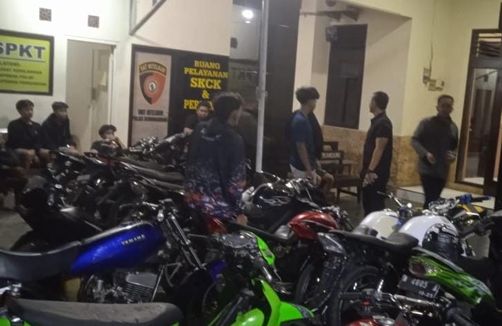 Belasan pemuda yang nekat balapan liar beserta motornya digiring ke Polsek Kedungkandang jajaran Polresta Malang Kota, Sabtu dinihari (13/9/25).