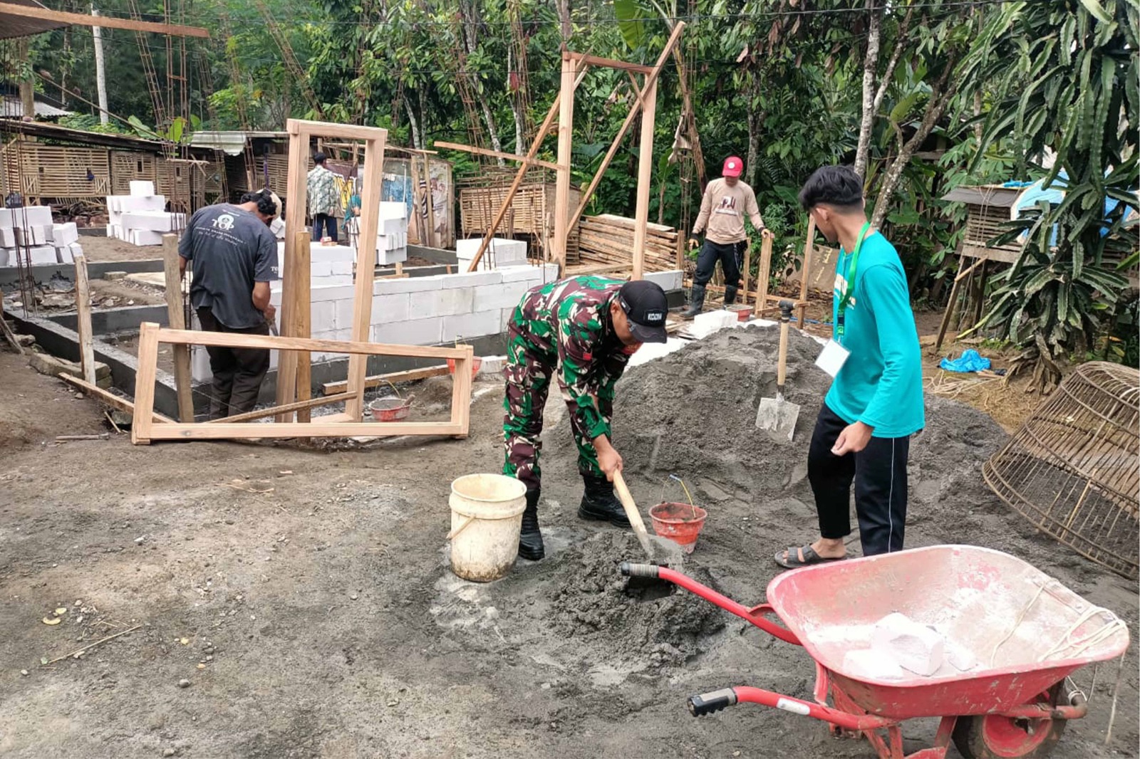 Suasana kebersamaan terasa begitu hangat dan penuh semangat saat Babinsa dan warga bergandengan tangan, saling membantu tanpa pamrih. Mereka bersama-sama mengangkat kayu, mencampur adonan pasir dan semen, memaku atap, hingga memperbaiki dinding rumah dengan wajah penuh antusias. Di sela-sela kerja keras, tawa dan canda terdengar akrab, menandakan betapa kuatnya semangat gotong royong yang masih hidup di tengah masyarakat. Kehadiran Babinsa di lapangan bukan sekadar memimpin, tetapi menjadi inspirasi dan penggerak utama yang menyatukan warga dalam satu tujuan mulia, membangun harapan melalui kebersamaan.
