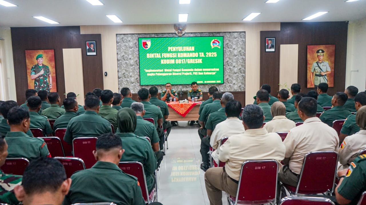 Indobangkit.com Gresik — Kodim 0817/Gresik menggelar kegiatan Penyuluhan Bintal Fungsi Komando Tahun 2025 bertempat di Aula Makodim 0817/Gresik. Dengan mengangkat tema “Implementasi Bintal Fungsi Komando dalam Menurunkan Angka Pelanggaran Disersi Prajurit, PNS dan Keluarga”, kegiatan ini diikuti oleh anggota dan PNS Kodim 0817/Gresik dan perwakilan Koramil jajaran. Rabu (26/11/2025).