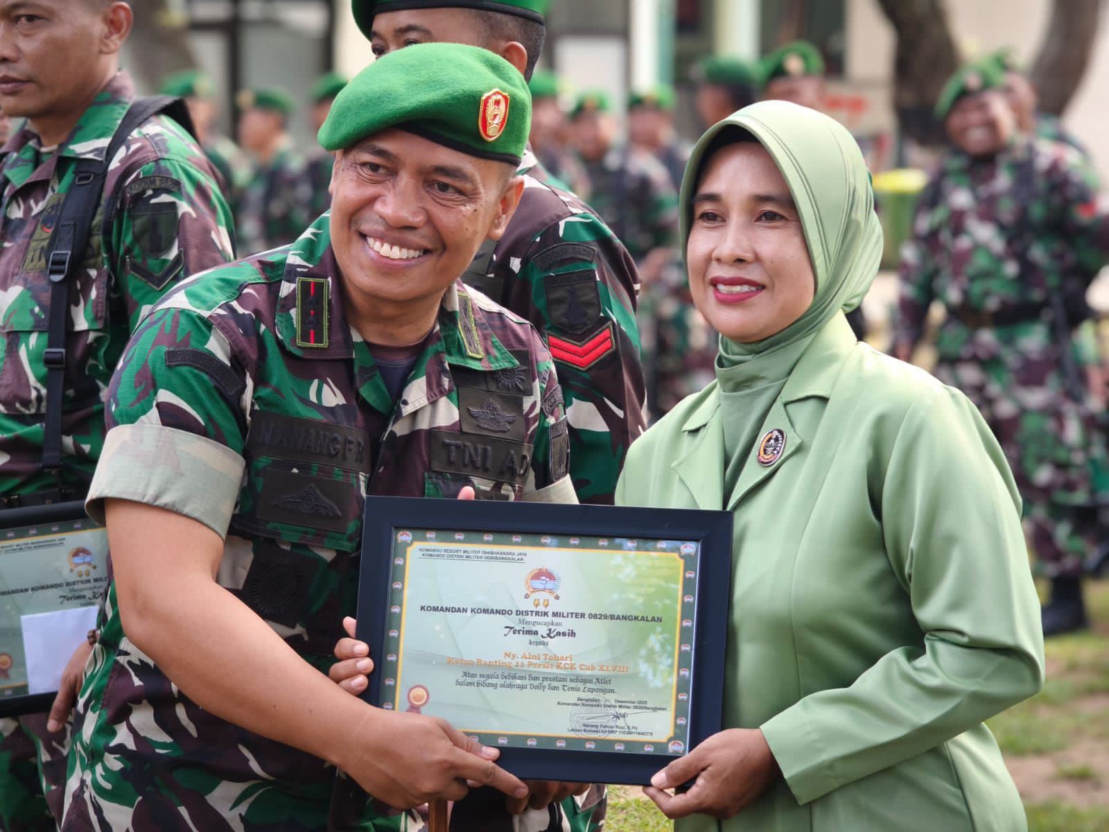 Usai upacara, Dandim 0829/Bangkalan Letkol Inf Nanang Fahrur Rozi, S.Pd secara langsung menyerahkan piagam penghargaan dan uang pembinaan kepada prajurit dan Persit yang menorehkan prestasi di berbagai cabang olahraga, di antaranya taekwondo, karate, pencak silat, menembak, selam, biliar, bola voli, hingga tenis lapangan. Penghargaan ini diberikan sebagai bentuk apresiasi atas dedikasi dan prestasi yang telah mengharumkan nama satuan.