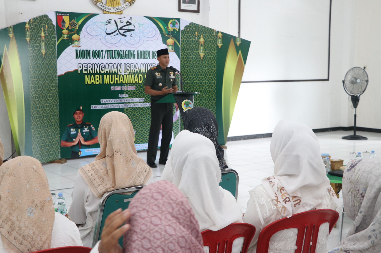 Komandan Kodim 0807/Tulungagung, Letkol Arh. Hanny Galih Satrio, S.I.P., M.Han., dalam sambutannya menyampaikan bahwa peringatan Isra Mi’raj hendaknya dijadikan sebagai sarana introspeksi diri, sekaligus penguatan moral dan spiritual prajurit dalam menjalankan tugas pengabdian kepada bangsa dan negara.